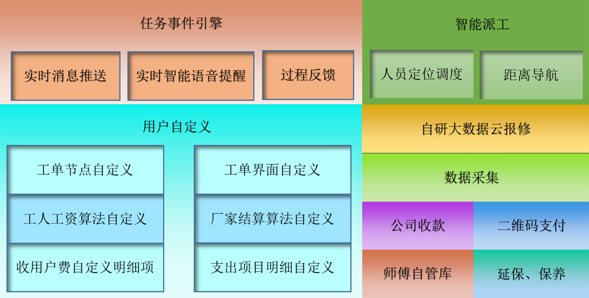 『智慧云平台-售后云』目前是针对电器售后服务行业的专业管理云平台,本平台功能涵盖了家电售后服务行业的各个环节,包含了从信息接单、信息派工、师傅接收、预约、上门、过程反馈、配件管理、完工反馈、用户回访、工资核算、厂家结算、保养提醒等环节的全方位管理和智能任务驱动,同时集成了大数据分析,引入了人工智能,重新定义售后服务行业管理系统新标准,引领售后服务进入人工智能新时代。解决了现有售后服务系统监管不全、不自动、不智能等问题。采用了大数据和人工智能技术,实现了售后服务中各个环节的智能化、自动化。让售后服务变得更快捷、更简单、更智慧。
